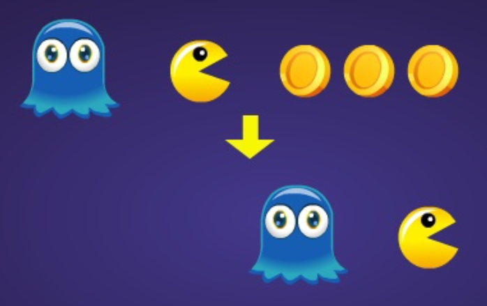 Recorre todo el laberinto y evita cruzarte con los fantasmas enemigos. Hay cuatro monedas, si comes una, tienes inmunidad por un lapso de tiempo con los fantasmas.